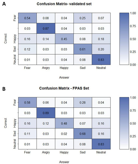 (A) Confusion matrix of the 500 emotional vocal stimuli. The rows indicate the presented emotional stimulus category (correct), the columns indicate the provided response (answer). The numbers indicate the proportional responses, averaged across the 40 participants. The diagonal shows the proportion of correct answers for each emotion. (B) Matrix of the stimuli used for the FPAS paradigms.