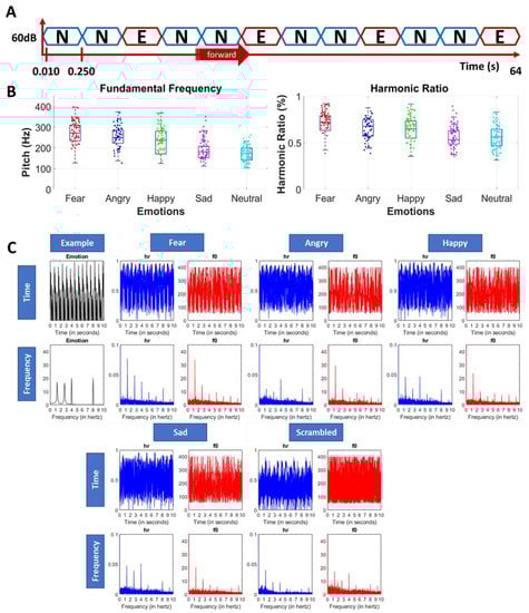 In addition to the four emotion category conditions (happy, angry, sad, and fear), we created a scrambled control condition with similar low-level acoustic characteristics but without the emotional content. We scrambled the sounds of the four emotion categories and the neutral emotion category based on the method of Dormal et al. (2018) [53], which results in sounds with equal frequency content and spectral-temporal structure as the original sounds, but with a different harmonicity. This ensures that the emotion category is no longer recognizable in the scrambled sounds, while the low-level acoustic cues are largely preserved. We created six scrambled control sequences with three male and three female speakers, covering the four emotion categories.