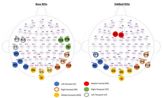 The explorative investigation of regions of interests resulted in the delineation of 11 significant electrodes for the base frequency (FC6, FT8, Iz, Oz, P10, P7, P9, PO7, T8, TP7, TP8) and 10 significant electrodes for the oddball frequency (F1, Fz, Iz, O1, O2, Oz, P7, P9, PO7, PO8). We divided the significant electrodes in four core ROIs based on the location of the electrodes, three for the base responses: ROI Left Parietal (LP: P7, P9, PO7, TP7), ROI Medial Occipital (MO: O1, O2, Iz, Oz), and ROI Right Temporal (RT: T8, FC6, FT8); and three for the oddball responses: ROI Left Parietal, ROI Medial Occipital, ROI Medial Frontal (MF: Fz, F1). In addition, to investigate possible lateralization effects and to include all significant electrodes, we also included the corresponding contralateral homologue brain areas in our analyses as extended ROIs, thus ROI Right Parietal (RP: P8, P10, PO8, TP8) and ROI Left Temporal (LT: T7, FC5, FT7). Note that O1 and O2 were not significant for the base frequency and TP7 not for the oddball frequency and we still included these electrodes in the ROIs to delimit the number of ROIs needed for the analyses. See Figure 3 for ROI placement for base and oddball separately with contralateral ROIs included.