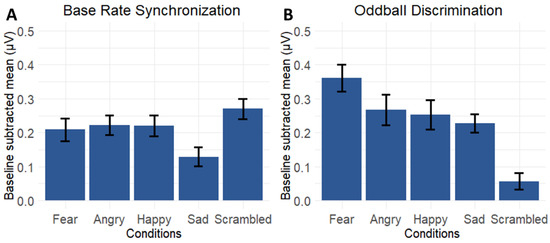 Comparison of the neural responses for the four conditions with emotional utterances and for the scrambled condition. (A) Base rate responses with standard error of the mean as the error bar. Summed baseline-corrected amplitudes (µV) at significant base rate harmonics (4 Hz and 8 Hz) and averaged across LP, MO, and RT ROIs reveal that sequences with sad utterances yield lower amplitudes. (B) Oddball responses with standard error of the mean as the error bar. Summed baseline-corrected amplitudes (µV) at oddball frequencies (1.333 Hz, 2.666 Hz, and 5.333 Hz) averaged across LP, MO, and MF ROIs reveal that fear discrimination yields the highest amplitudes, and that automatic vocal emotion discrimination is significantly hampered by scrambling the stimuli.