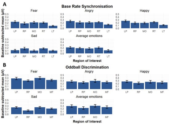 Comparison of the neural responses for the four conditions with emotional utterances as a function of spatial location with standard error of the mean as error bar (ROI). (A) Base rate synchronization. Summed baseline-corrected amplitudes (µV) at base rate harmonics reveal that the sad condition yields the lowest responses, and that ROI right temporal (RT) hosts the highest responses. (B) Oddball discrimination. Summed baseline-corrected amplitudes (µV) at oddball frequencies reveal that fear and angry yield the highest amplitudes and that ROIs left parietal (LP) and medial occipital (MO) show higher activation than the other ROIs.