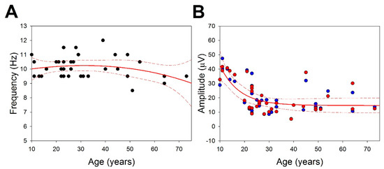 Another relevant measurement of the EEG used in clinical practice is the amplitude and the PDR, usually measured in the parieto-occipital channels (P3-O1 and P4-O2). We addressed the dependence of these variables on age. In Figure 2A, we shows that the PDR can be fitted to this function (r = 0.2977, p < 0.05, Student’s t-test), with a maximum of 10.3 Hz at 35 years old. Fitting the data to a linear function, we obtained a lower value correlation (r = 0.1965; n.s).
