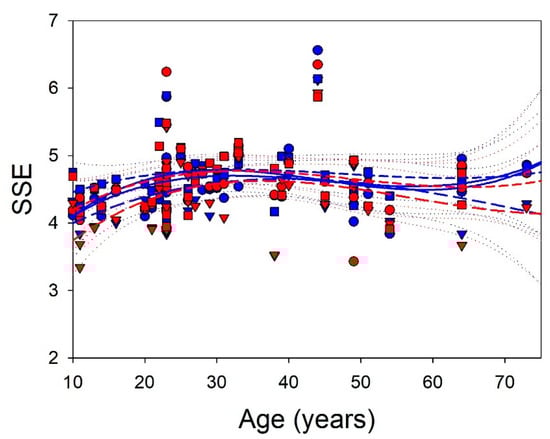 Relationship between SSE and age. Dots = frontal; triangles = parieto-occipital; squares = temporal; dashed lines = quadratic regression functions; dotted lines = 95% interval coefficient; blue = left; red = right.