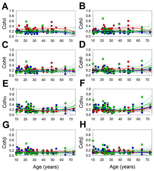Therefore, we did not find an age dependence of synchronization as well defined as that for PS, except for the Cohα, which fits very well to the quadratic functions of all three groups.
