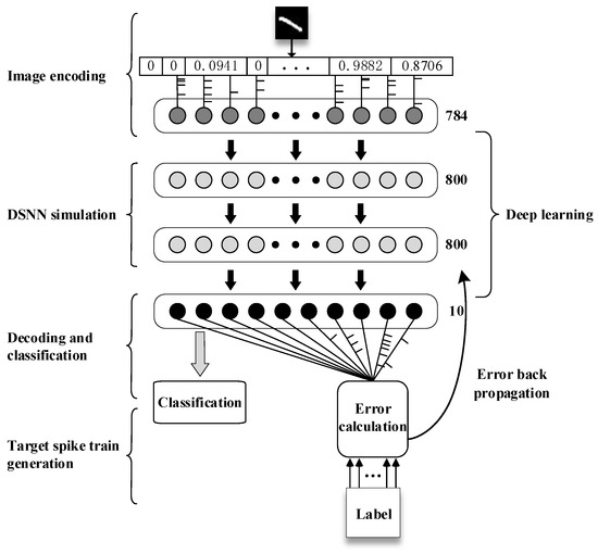 The biological brain has a complex structure and function, and carries out information transmission, transformation, and learning under the synaptic plasticity mechanism. Artificial neural networks (ANNs) are abstractions and simulations of the structure and function of biological nervous system, and play an extremely crucial role in signal processing and pattern recognition [1,2]. Spiking neural networks (SNNs) are the new generation of neural computing models, which are composed of more realistic biological spiking neuron models as the basic units [3]. The spike train is the carrier of information representation and processing, and this type of neural encoding method (temporal encoding) integrates multiple aspects of neural information (time, frequency, phase, etc.) [4]. Compared with the traditional ANNs based on frequency encoding, SNNs are more capable of impressive computing power and eminently suitable for complicated spatio-temporal pattern processing. The biological brain with multilayer structures can transform and extract signals layer by layer. According to this idea, researchers have proposed different ANNs with deep structures and their deep learning methods [5,6,7]. Deep learning has led to major advances in image understanding, target detection, speech recognition, natural language processing and other fields, which provides an efficient computational mode for complex pattern recognition problems [8,9]. According to the event-driven network simulation process, the spike-based learning methods of SNNs are considered to be more biologically plausible. It will be a very challenging task in machine learning research to construct the widely applicable supervised learning methods for deep spiking neural networks (DSNNs) combining the spike-based computational mode of SNNs with the signal deep transformation process [10].