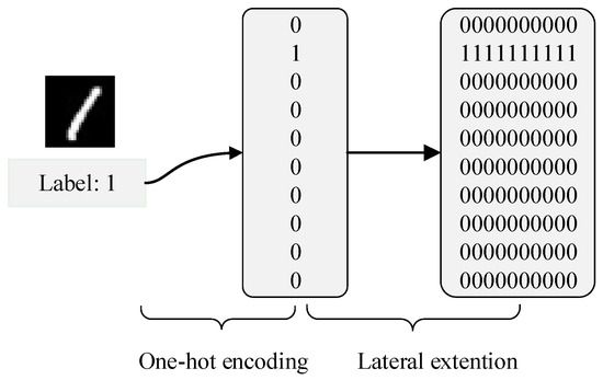 In the experiment, each label corresponds to one target neuron in the output layer of the DSNN. Under the ideal condition, when the input sample corresponding to the assigned label is inputted in the network, the target neuron is activated and emits spikes evenly, while other neurons in the output layer remain rest during the simulation interval. Therefore, the target spike trains are generated through the linear encoding method [45], and the detailed label encoding process is shown in Figure 3. Label data are first processed by the one-hot encoder, and the encoded data are then laterally extended to target spike trains of 10 neurons in the output layer over the simulation interval.