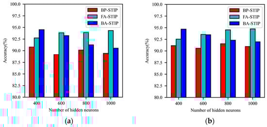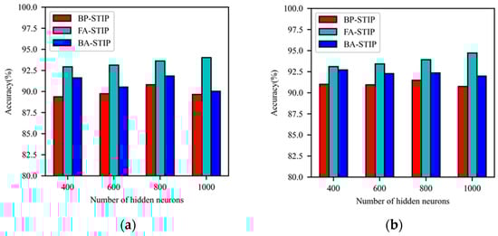 Through the experiments, it is found that the BP-STIP learning algorithm constructed by using the inverse multiquadratic kernel function is incapable of processing and analyzing information, and cannot complete feature learning on MNIST dataset, but the FA-STIP and BA-STIP learning algorithms based on this kernel function exhibit learning ability. After 150 iterations of FA-STIP or BA-STIP algorithms based on inverse multiquadratic kernel function, the network classification performance is shown in Figure 7. With the increasing of the number of hidden layer neurons in the DSNN, the learning effect of both learning algorithms shows an upward trend. In addition, the classification accuracy of the FA-STIP algorithm is better than that of the BA-STIP algorithm when the network scale is relatively large. When the number of hidden layer neurons is set to 400 and 600, the learning performance of the BA-STIP algorithm is better than the FA-STIP algorithm. When the number of hidden layer neurons is 800 and 1000, the learning accuracy of the FA-STIP algorithm is higher. In general, the FA-STIP and BA-STIP algorithms based on inverse multiquadratic kernel have learning ability on complex datasets, but their learning performance is poor compared with those algorithms based on Gaussian kernel and Laplacian kernel functions.