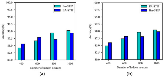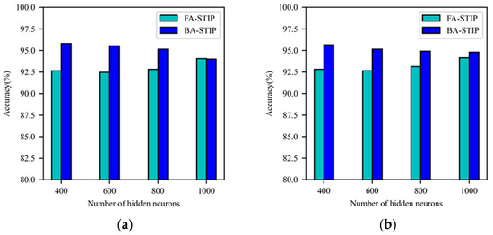 Similarly, using the BP-STIP algorithm based on the α-kernel function to classify the MNIST dataset, the experiment found that it is unable to complete the effective learning and classification of this task. While the corresponding FA-STIP and BA-STIP algorithms can learn the features of the MNIST dataset and complete classification, and the accuracy under different network scales is shown in Figure 8. Based on the α-kernel function, the learning performance of the BA-STIP algorithm is significantly better than the FA-STIP algorithm. However, with the increment of the number of hidden layer neurons in DSNNs, the classification accuracy of the FA-STIP algorithm still maintains the trend of growth, and that of the BA-STIP algorithm shows a constantly decreasing trend. The FA-STIP algorithm achieves the highest classification accuracy under the network structure of 784-1000-1000-10, with 94.07% on the training set and 94.16% on the testing set. When the network scale is 784-400-400-10, the classification accuracy of the BA-STIP algorithm is 95.80% for the training set, and 95.65% for the testing set. The BA-STIP algorithm based on the α-kernel function achieves good learning ability under the current network settings.