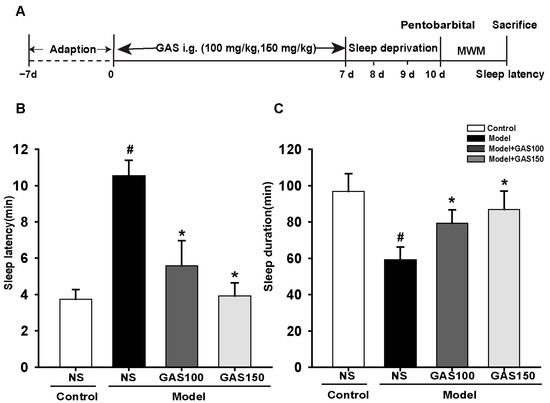 Figure 1. Effects of GAS on REM sleep-deprivation-induced sleep latency and sleep duration in rats: (A) the experiment design; (B) sleep latency; (C) sleep duration. Control + NS group: SD rats were lavaged with normal saline; Model + NS group: REM sleep-deprived rats were lavaged with normal saline; Model + GAS100, GSA150 groups: REM sleep-deprived rats were lavaged with gastrodin (100 or 150 mg/kg). # p < 0.05, versus control group; * p < 0.05, versus model group; (mean ± SD, n = 5).