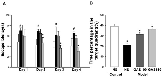 Figure 2. Effects of GAS on cognitive deficits in REM sleep-deprived rats: (A) the escape latency for 4 continuous days; (B) time spent in the target quadrant. # p < 0.05, versus control group; * p < 0.05, versus model group; (mean ± SD, n = 7–10).