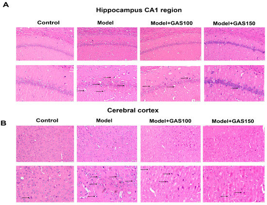 The hippocampal CA1 region and the cortex of the rats were observed with HE staining (Figure 3). Neuron loss, shrinkage, and severe cellular edema were observed both in the CA1 areas of the hippocampus and the cortex of the REM sleep-deprivation model group. However, treatment with GAS attenuated REM sleep-deprivation-induced neuronal damage, especially in the GAS (150 mg/kg) group.