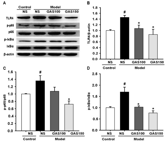 Figure 4. Effects of GAS on TLR4/NF-κB signaling pathway in REM sleep-deprived rats: (A,B) expression of TLR4, p-p65, p65, p-IκBα, IκBα proteins in the hippocampus; (BD) quantitation of TLR4, p-p65 and p-IκBα levels. # p < 0.05, versus control group; * p < 0.05, versus model group; (mean ± SD, n = 3).