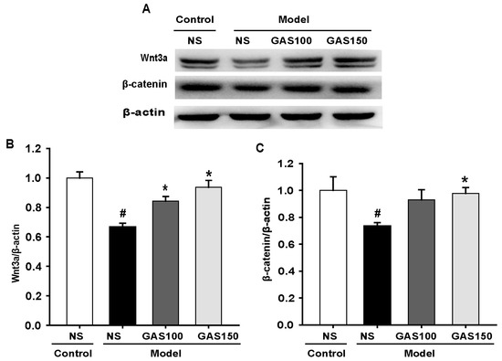 Figure 5. Effects of GAS on Wnt/β-catenin signaling pathway in REM sleep-deprived rats: (A) expression of Wnt3a and β-catenin proteins in the hippocampus; (B,C) quantitation of Wnt3a and β-catenin levels. # p < 0.05, versus control group; * p < 0.05, versus model group; (mean ± SD, n = 3).