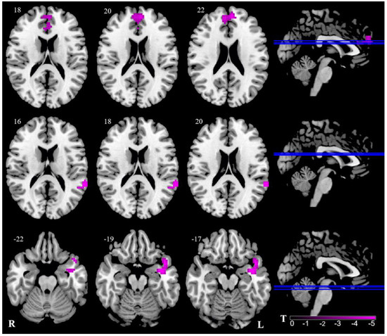 Abnormal FC of VM patients in contrast to HC. Pink signifies decreased ALFF. The axial image was overlaid on the transverse section of the MNI-152 standard anatomical image. Blue line represents the layers in the sagittal. Numbers indicate z slice. The color scale denotes the t-value. R, right; L, left.
