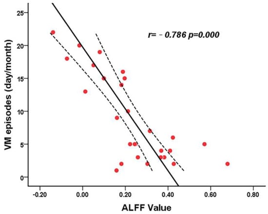 The ALFF values in the left thalamus significantly and negatively correlated with VM episode frequency in the VM group (r = −0.768; p = 0.000, Bonferroni correction with p < 0.05/12 = 0.004, Figure 3). Abnormal ALFF values were not found to be correlated with scores on VAS, MIDAS, and DHI and disease duration in the VM group. Furthermore, FC alterations were not found to be significantly correlated with clinical parameters in the VM group.