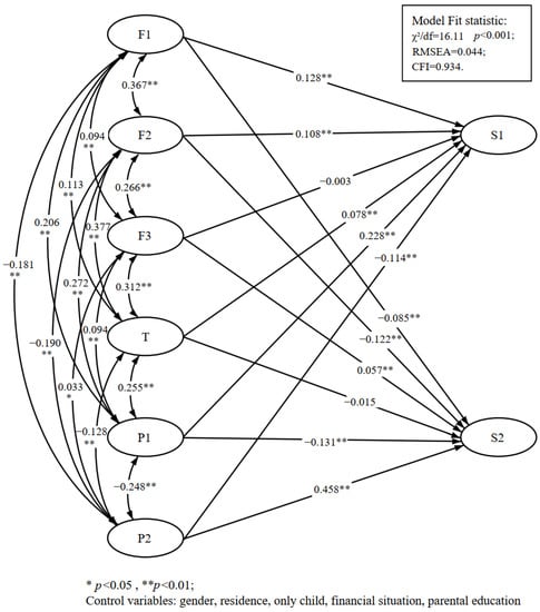 Table 2 shows the results of the correlation analysis for each central variable. Family effects were used for the latent variables “Parental relationship (F1)”, “Parental discipline (F2)”, and “Parent–school contact (F3)”. These three latent variables contain seven observed variables (x1–x7), among which the correlation coefficients of all variables are less than 0.5, except for the correlation coefficient between parent-initiated school contact and passive contact. This reflected a mutual influence between active contact and passive contact, while the correlations of the other variables were not obvious. The various aspects of the family’s effect on the development of adolescent social behavior are considered. Good family relationships were a facilitator of children’s prosocial development (p < 0.01) and were negatively associated with the development of misconduct (p < 0.01). The better the relationship between the child and the parents was, the better the development of prosocial behavior.