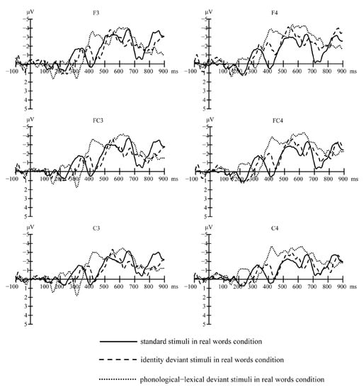 Based on the grand-average waveforms obtained from the experiment and MMN time windows in previous studies [,,], we chose 350–450 ms after the stimuli onset as the MMN time window for the real words’ condition and chose 200–300 ms after the stimuli onset as the MMN time window for the pseudo-words’ condition. We first took the Fz electrode as the reference point and detected the MMN peak latency in the time windows for the real and pseudo-words’ conditions. Then, based on the present experiment’s topography and MMN distributions [,], we selected six electrodes, F3, FC3, and C3 on the left scalp and F4, FC4, and C4 on the right scalp, and calculated the MMNs mean amplitudes with a moving time window ranging from 20 ms before the detected peak to 20 ms after that peak for each electrode.