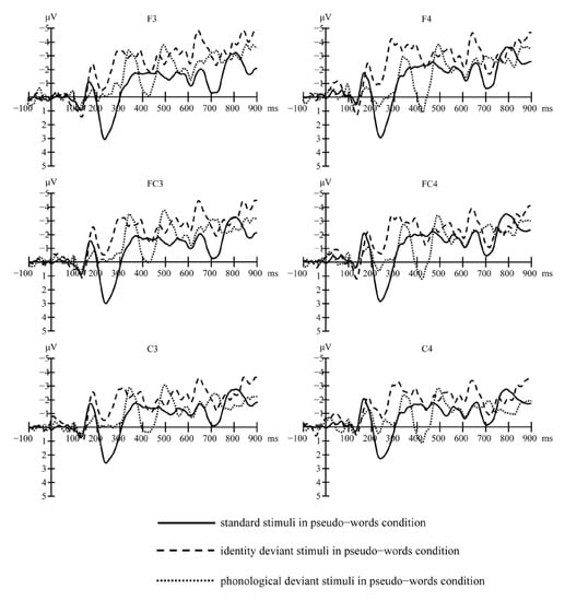 Grand-average waveforms evoked by the standard and deviant stimuli in pseudo-words’ condition at electrode locations F3, F4, FC3, FC4, C3, and C4.