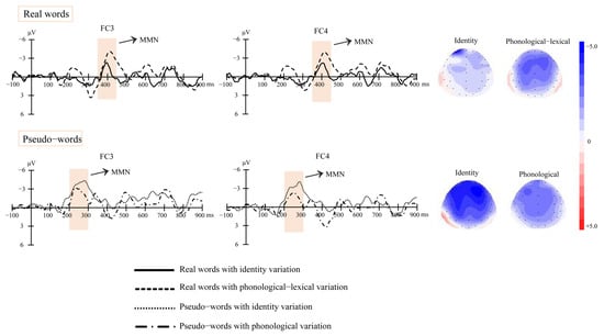 MMN waveforms evoked by the different deviant conditions at electrode locations FC3 and FC4, and the topographies of MMNs (real words: 350–450 ms; pseudo-words: 200–300 ms) in different deviant conditions.