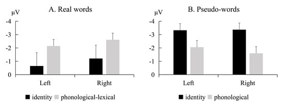 MMN amplitudes in the real words’ (A) and pseudo-words’ (B) deviant conditions. Error bars represent one standard error.