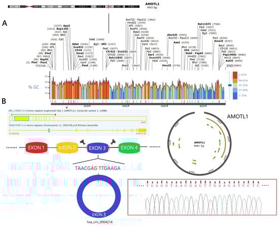 Genetic information of host gene AMOTL1 and hsa_circ_0004214. (A) Genetic information of host gene AMOTL1. Full-length gene visualization analysis, including base pair annotation, the location of host gene in Genome-wide, GC ratio (%) and common commercial targets. (B) Genetic information of hsa_circ_0004214. Containing host gene exon positions, circRNA alternative splicing, circular docking sequence and basic biological information.