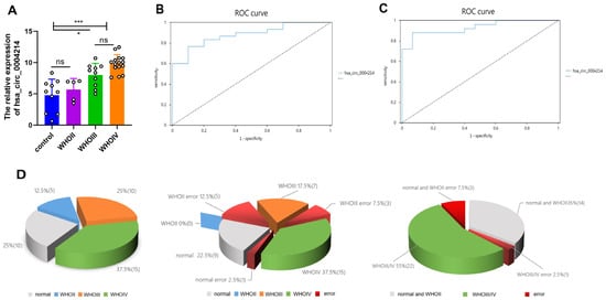 Expression level and diagnostic value of hsa_circ_0004214 in different grades of glioma. (A) Expression level of hsa_circ_0004214 in different grades of glioma (* p < 0.05, *** p < 0.005). (B) hsa_circ_0004214 distinguishes non-glioma brain tissue from control group and glioma tissue, and its ROC curve. (C) hsa_circ_0004214 distinguishes low-grade glioma (control + WHO II) and high-grade glioma (WHO III/IV), and its ROC curve. (D) Evaluation of data for different diagnostic categories via pie charts. The frequency of diagnostic success and error were recorded, respectively.