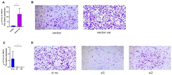Judging the change of glioma cell migration capacity by changing the expression level of hsa_circ_0004214 in U87. (A) U87 cells transfected with hsa_circ_0004214 overexpression plasmid for 48 h, and the level of hsa_circ_0004214 was detected by RT-qPCR (* p < 0.05). (B) Transwell assay detected the migratory capacities of U87 cells after up-regulated the level of hsa_circ_0004214. Scale bar, 100 μm (* p < 0.05). (C) U87 cells transfected with two siRNAs specifically targeting hsa_circ_0004214(si1, si2) for 48 h, and the level of hsa_circ_0004214 was detected by RT-qPCR. (D) Transwell assay detected the migratory capacities of U87 cells after down-regulated the level of hsa_circ_0004214. Scale bar, 100 μm.