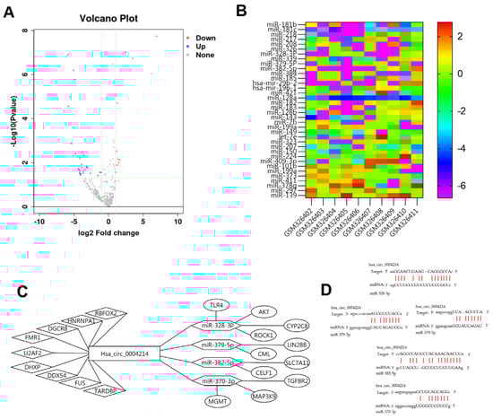 Construction of regulatory network associated with hsa_circ_0004214. (A) The volcano plot showing the expression profile of miRNAs in glioma tissue samples. (B) The heat map showing the top 20 down-regulated miRNAs and 10 up-regulated in glioma tissue samples compared with non-glioma brain tissue samples analyzed by RNA sequencing. (C) Construction of a RBP/circRNA/miRNA/mRNA ceRNA Interaction network. The network consists of hsa_circ_0004214, 4 miRNAs, 12 RBPs, and 11 mRNAs. (D) From ENCORI, we predicted binding sites of miR-28-3p, miR-379-5p, miR-382-5p, and miR-370-3p with hsa_circ_0004214.