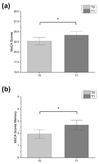 Bar-graphs showing significant changes over time. (a) MoCa scores in experimental group. (b) MoCa memory sub-scale score in experimental group. Error bars represent standard error (* p < 0.05; Friedman test).