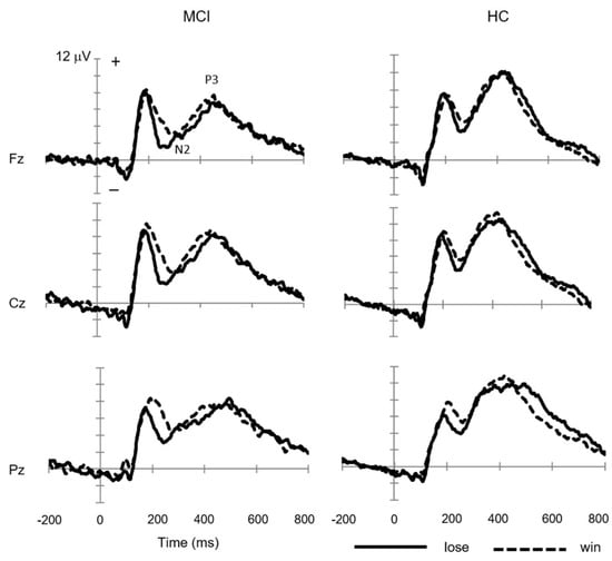 Grand-average waveforms at Fz, Cz, and Pz to feedback stimuli for win and lose trials in mild cognitive impairment (MCI, n = 13) and healthy control (HC, n = 13) groups.