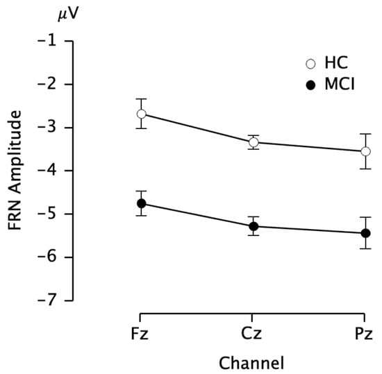 Comparisons of FRN amplitude between mild cognitive impairment (MCI) and healthy control (HC) groups. Values are mean ± S.E. FRN: feedback-related negativity.