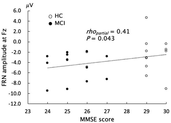 Partial correlation analyses were performed between the neuropsychological data and FRN across all subjects, with adjustment for age. The FRN amplitude at Fz was slightly correlated with the MMSE score (Spearman’s rhopartial = 0.41, uncorrected p = 0.043, Figure 4), indicating that subjects with a lower MMSE score showed a larger negative amplitude of FRN. However, when we added the group as another covariate, the correlation was diminished. The FAB, SDS, and AS scores did not show any significant correlations with any measures for FRN (Table 2).