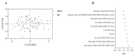 The discrepancy of peripheral immune traits between MSA and HC. (A) Obvious separation in the PLS-DA model indicates a different structure of peripheral immune traits between MSA and HC. (B) Top 10 peripheral immune indices with highest VIP value between MSA and HC. Abbreviations: MSA: multiple system atrophy; HC: healthy controls; PLS-DA: partial least squares discriminate analysis; VIP: variable importance in the projection.