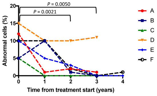 The relationship between time since treatment initiation and the percentage of abnormal cells in the peripheral blood buffy coats is shown in Figure 2. Overall, a substantial reduction in the percentage of cells with abnormal storage was observed. The mean (95% CI) differences in percentage of abnormal cells in the buffy coats compared to the baseline measurements were as follows: one year: −3.5 (−10.8 to +3.8, p = 0.36), two years: −6.5 (−3.5 to −9.5, p = 0.002), and three years: −7.5 (−3.3 to −11.8, p = 0.005).