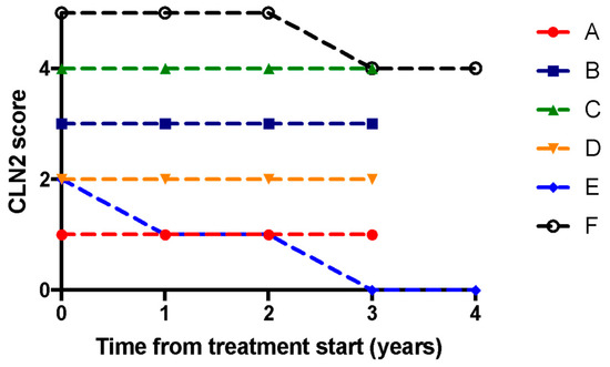 The relationship between time since treatment initiation and the CLN2 scores is shown in Figure 3. The median (range) CLN2 score at the baseline was 2.5 (1–5). Two of the six patients underwent reductions in CLN2 scores with treatment (one declining from 2 to 0 and the other from 5 to 4); the other four patients remained stable. There was no significant difference in CLN2 scores over the time points in the study (p = 0.25). This was in line with the findings of the clinical trial, which demonstrated stabilisation of CLN2 scores in patients treated with cerliponase alfa compared to natural historical controls [31].