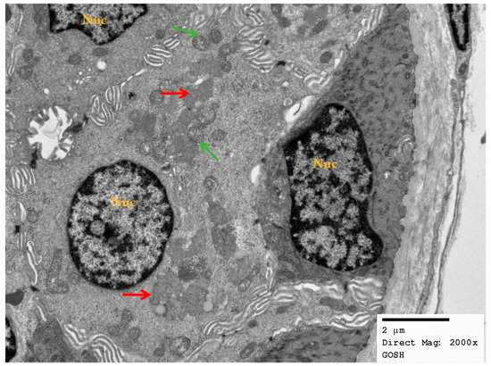 Low-power electron micrograph, mag.×2000, of secretory epithelial cells from an eccrine sweat gland with abnormal storage inclusions present in clusters of expanded lysosomes (red arrow). Numerous mitochondria with normal morphology present (green arrow) and prominent nuclei (Nuc) also with normal appearances.