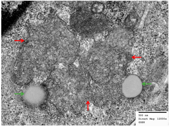 High-power electron micrograph, mag. ×12,000, of membrane-bound storage inclusions in secretory epithelial cells from eccrine sweat gland with curvilinear-like bodies (red arrow) and lipid droplets (green arrow).