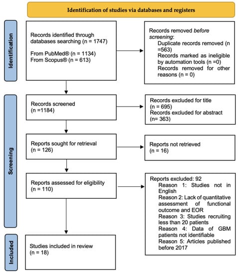 Preferred Reporting Items for Systematic reviews and Meta-analyses guidelines (PRISMA) were followed to conduct this systematic review [] (Figure 1). We performed a broad systematic literature search in Pubmed/Medline and Scopus for all studies investigating the application of intraoperative imaging techniques in GBM surgery to achieve the best onco-functional balance. We searched for studies published from 2017 up to the 9th of November 2022, using the following MeSH: “Intraoperative MRI (IoMRI)”, “Intraoperative Ultrasound (IoUS), “Sodium Fluorescin”, “5-ALA”, “intraoperative Neuronavigation”, “intraoperative tractography”, “High-grade glioma (HGG)”, “Glioblastoma (GBM)”, “Quality of Life (QoL)”, “Karnofsky Performance Status (KPS)”, and “extent of resection (EOR)”, combined using Boolean operators “AND” and “OR”. Furthermore, we manually screened reference lists of the most relevant systematic reviews and meta-analyses related to this study. Duplicate articles were eliminated using Microsoft Excel 16.37. Since the search combing GBM with the other MeSHs and free text terms revealed limited results, we enlarged the research including in our query “high grade glioma” (HGG). The protocol of this review has been prospectively registered in Open Science Framework and it is available online at https://doi.org/10.17605/OSF.IO/3FDP9 (accessed on 16 December 2022).