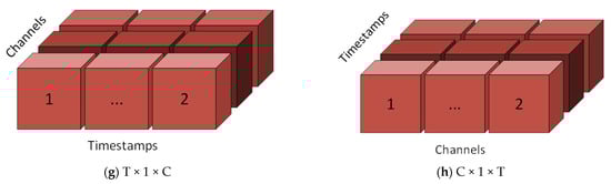 In both datasets, the highest accuracy values were achieved with T × C and T × 1 × C input shapes respectively (Figure 6). Researchers can train their models by selecting appropriate input shapes for 2D and 3D CNN architectures if needed. In both datasets, it has been observed that parallel changes in the accuracy and epoch time values are obtained as the input shape changes (Figure 6 and Figure 7). However, it cannot be concluded that a given input shape will achieve the same success in every CNN model and every dataset to be used (Figure 6). Therefore, it was concluded that the researchers should try different input shape structures for the CNN models they set up.