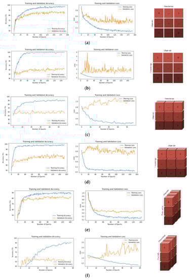 In both datasets, the average accuracy values span a wide range (range value of 36.26 for 2A dataset and 20.10 for 2B dataset). It has been observed that some input shapes cause high levels of overfitting during training (Figure 4b,f,h, and Figure 5)b,f,h. Although these input shapes have very high training accuracy values, their validation values are quite low. Input shapes have been observed to have a significant effect on epoch times as well (Table 3). In both datasets, the epoch times are spread over a wide range (range value of 21 for dataset 2A and range value of 6 for dataset 2B). As a result, it has been determined that input shape structures are a very important parameter in the performance of CNN models (Table 1 and Table 2).