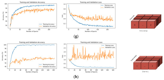 Training—Validation Accuracies and Losses for BCI-IV-2A Dataset and Input Shapes. (a) T × C, (b) C × T, (c) T × C × 1, (d) C × T × 1, (e) 1 × T × C, (f) 1 × C × T, (g) T × 1 × C, (h) C × 1 × T.