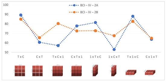 The models trained with raw data, without applying any preprocessing methods, showed a classification success between 53.03% and 89.29% for the BCI-IV-2A dataset and between 65.38% and 84.94% for the BCI-IV-2B dataset. Classification accuracies according to the input shape change are shown in Figure 6.
