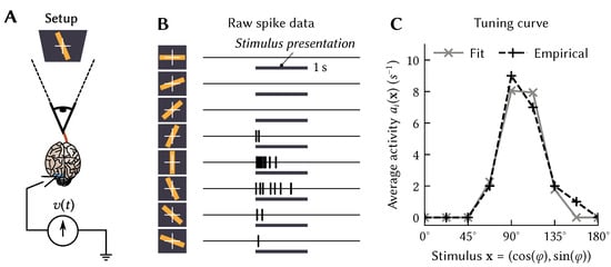 However, since we defined these atemporal tuning curves as mappings over some d-dimensional vector space, we do not have to limit tuning curves to scalar variables such as . Instead, tuning curves can be defined over various modalities and mathematical objects, such as images, sounds, probability densities and even symbols [1,11,16]: anything that can be treated as a d-dimensional vector. Keeping this in mind, and considering the Hubel and Wiesel experiment mentioned above, we can make three key observations about tuning curves: