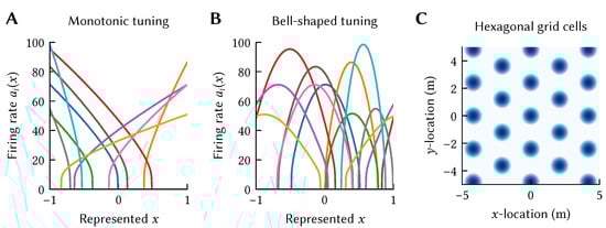 Examples of tuning curves in the linear-nonlinear tuning-curve family with a LIF nonlinearity G. (A) Using results in monotonic tuning over a quantity x. Coloured lines correspond to individual neurons i. (B) Bell-shaped tuning-curves can be obtained with and transforming . (C) Tuning curve of a single hexagonal grid cell constructed using spatial semantic pointers (SSPs) with (deep blue corresponds to a firing rate of 100 ).