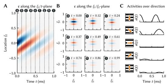 Model of a neuron in visual cortex tuned to downwards motion. The spatiotemporal encoder e is a two-dimensional Gabor filter sampled in two spatial dimensions , that correspond to coordinates in the visual field [25,26]. (A,B) Different slices through e. Blue corresponds to positive, red to negative values. (C) Computing the neural activity for a grating pattern x moving in the arrow direction. Downwards motion results in the strongest response amplitude.