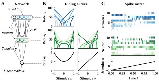 Transforming signals. (A) Two LIF neuron populations (blue, green) are tuned to variables x, y. The first population projects onto to the second; we impose the relationship when solving for weights. The black “neuron” is a linear readout with . (B) Tuning curves of the neurons depicted in (A). Left column depicts the tuning curves over x, right column the tuning curves over y. The tuning of the first (blue) population is undefined with respect to y. When controlling the stimulus variable x the network implicitly computes . (C) Spike raster of the two LIF populations when varying the stimulus x over time; although we solve for weights using a rate approximation , the resulting network is compatible with spiking neurons.