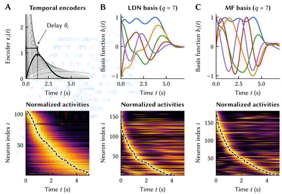 Curiously, as is depicted in Figure 5B and C, implementing these LTI systems in a neural population results in temporal tuning that is qualitatively similar to our “ad hoc” approach from Figure 5A; indeed, the LDN reproduces key features of hippocampal time cells [30]. That is, by creating this network that is just meant to optimally store information across a window in time, the resulting tuning curves are a close match to those seen in biological systems. This result is robust across a variety of temporal bases, with different bases having some advantages in certain conditions [24].
