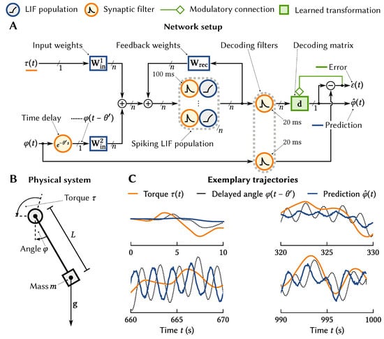 As an example, consider a network for predicting the current position of a simple arm model, i.e., a single-joint pendulum (cf. Figure 6A, B). We feed into the model the torque commands being sent to the arm and a delayed version of the position of the arm . This delay reflects the fact that in biological systems there tends to be a significant (tens of milliseconds) delay in data returning from the sensory periphery. Feeding these two signals into a neuron population with time cell tuning, (Implementing time cell tuning over two variables can be accomplished by implementing two LDN LTI systems in the same neuron population; i.e., the represented state variable is [24]). We now have a neural population that encodes in its temporal tuning curves these two important variables (the command sent to the arm and the last known position of the arm) over a window in time.