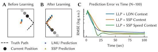 Figure 7 demonstrates LLP learning to predict the movement of a ball bouncing in a box over 0.5 s into the future. Initially, the algorithm makes no useful prediction, but as it collects more observations it learns to accurately predict the future motion over that window of time. We assess the performance of the model by looking at the RMSE between the predicted, , and actual, , trajectory of the ball at time t (Figure 7C).