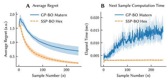 The regret performance of Bayesian optimization implemented using Gaussian processes with a Matern kernel (GP-BO Matern) and implemented using the Hexagonal Spatial Semantic Pointer representation (SSP-BO Hex) on the Himmelblau standard optimization test function (A). The regret performance of SSP-based algorithms is statistically equivalent to the GP methods, however, by working in the neurally-plausible feature spaces, the computation time becomes constant in the number of samples collected (B). Figured adapted from [65].